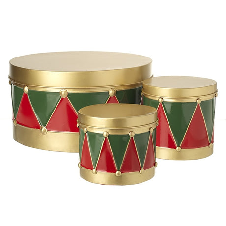 Gold Red Green Metal Tin Drums - Set of 3