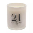 A 21st champagne candle. This simple yet elegant candle is a memorable way to commemorate a milestone birthday. The white glass case showcases an ‘21 Twenty One’ printed silver foil title. Inside sits a champagne scented wax candle which boasts a 26 hour burn time. The candle is packaged in a kraft closed box.