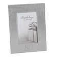 A beautiful mirrored glitter frame with '80' detail. This wonderful freestanding frame makes the perfect gift for a 80th birthday, ideal for displaying a memory from the day. It features a glass mirrored frame, embellished with silver glitter and has the number '80' below the picture.