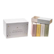 The outer cardboard box features a matte white finish, enhanced by gold detailing to both the inner and outer lid, including ‘Precious little memories’ wording. There are five small, multicoloured matchbox-style boxes within the keepsake box, each with further gold detailing on the spines.