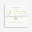 Capture every magical moment with your loved ones this festive season with our twinkling Christmas A Little Bracelets! Made to last and be loved for a lifetime, our Christmas A Little 'Merry Christmas Lovely Daughter' Bracelet In Silver Plating is threaded with our classic silver-plated beads and decorated with a pretty heart charm to represent your love. Wrapped around a shimmering starburst-print card and framed by a sweet poem, it's sure to make a wonderful stocking filler or under-the-tree treat.