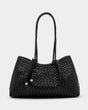 The Nova Small Shoulder Tote in Black is perfect for lightweight summer styling. Featuring hand-woven vegan leather, a signature branded bag charm, and long comfortable handles that make it easy to carry over the shoulder. Complete with a secure magnetic closure, it adds a touch of understated elegance to any outfit.