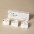 The Set Of 3 Heart Candles - Engaged is the perfect gift for celebrating special relationship milestones. Three white ceramic heart-shaped candles are presented in an elegant slide-out box featuring the text "a promise of love", creating a meaningful keepsake. With a Peony, Lychee and Rose scent.